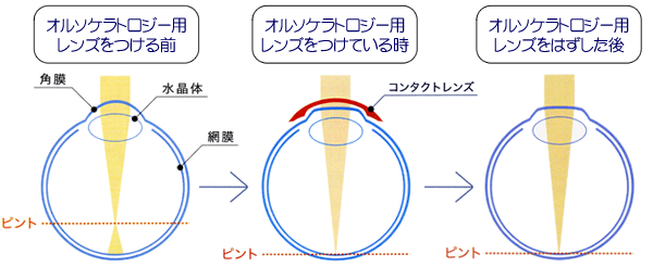 左の画像は、オルソケラトロジー用レンズをつける前の近視の人の眼の中の光のまとまり具合をあらわしています。眼の中に入る光が網膜上で集まらず、網膜の手前で集まっているので、ピントが網膜上にきていないピンボケ状態になっています。中央の画像は、オルソケラトロジー用レンズ(図では茶色のコンタクトレンズ)をつけることで眼の表面の角膜が変形させられて平坦になり、眼の中に入る光が網膜上でうまく集まるようになっていることをあらわしています。右の画像は、オルソケラトロジー用のレンズを寝ている間にはめたことで変形させられた角膜が、レンズをはずした後も、一定時間はその平坦な形を保っていて、そのために眼の中に入る光が網膜上でうまく集まるということをあらわしています。この右の画像の状態が、寝ている間にはめていたオルソケラトロジー用レンズを、起きた後に眼からはずして、裸眼で日常生活を送っている間の眼の状態だということです。