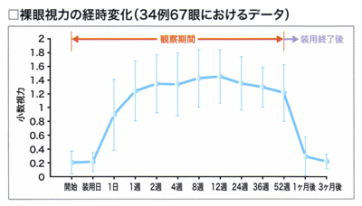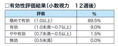 東レ株式会社の製品説明資料によれば、国内2施設において2年間にわたり実施された臨床試験(44人87眼)では、12週後には98.5%の人が小数視力で0.7以上になっており、89.5%の人が小数視力で1.0以上になっていました。