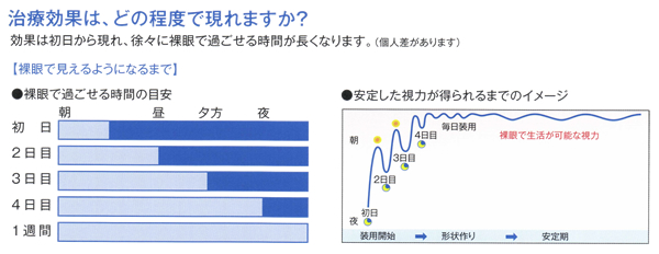 角膜のやわらかさには個人差があるので、同じオルケラトロジー用レンズを使って角膜の形を変えようとしても、その変り具合には微妙に差がでてきますから、裸眼視力の変化のスピードが皆同じになるわけではありません。しかし、オルソケラトロジーという視力矯正方法が患者さんの眼にうまく合っている場合には、裸眼視力の変化は数日のうちにある程度は自覚できるものだと考えてください。